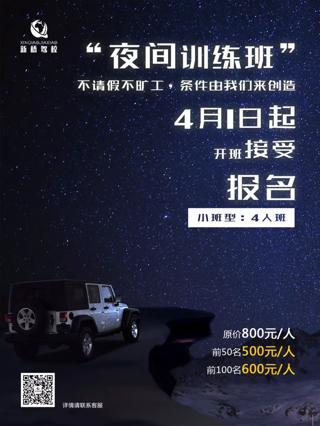 現(xiàn)在不用擔(dān)心了,新橋駕校特辟個(gè)性化服務(wù),專門為“朝九晚五”的上班族來(lái)學(xué)車開(kāi)設(shè)了“夜間訓(xùn)練班”,讓想學(xué)車卻苦于時(shí)間有限的學(xué)員們擁有更多的選擇!